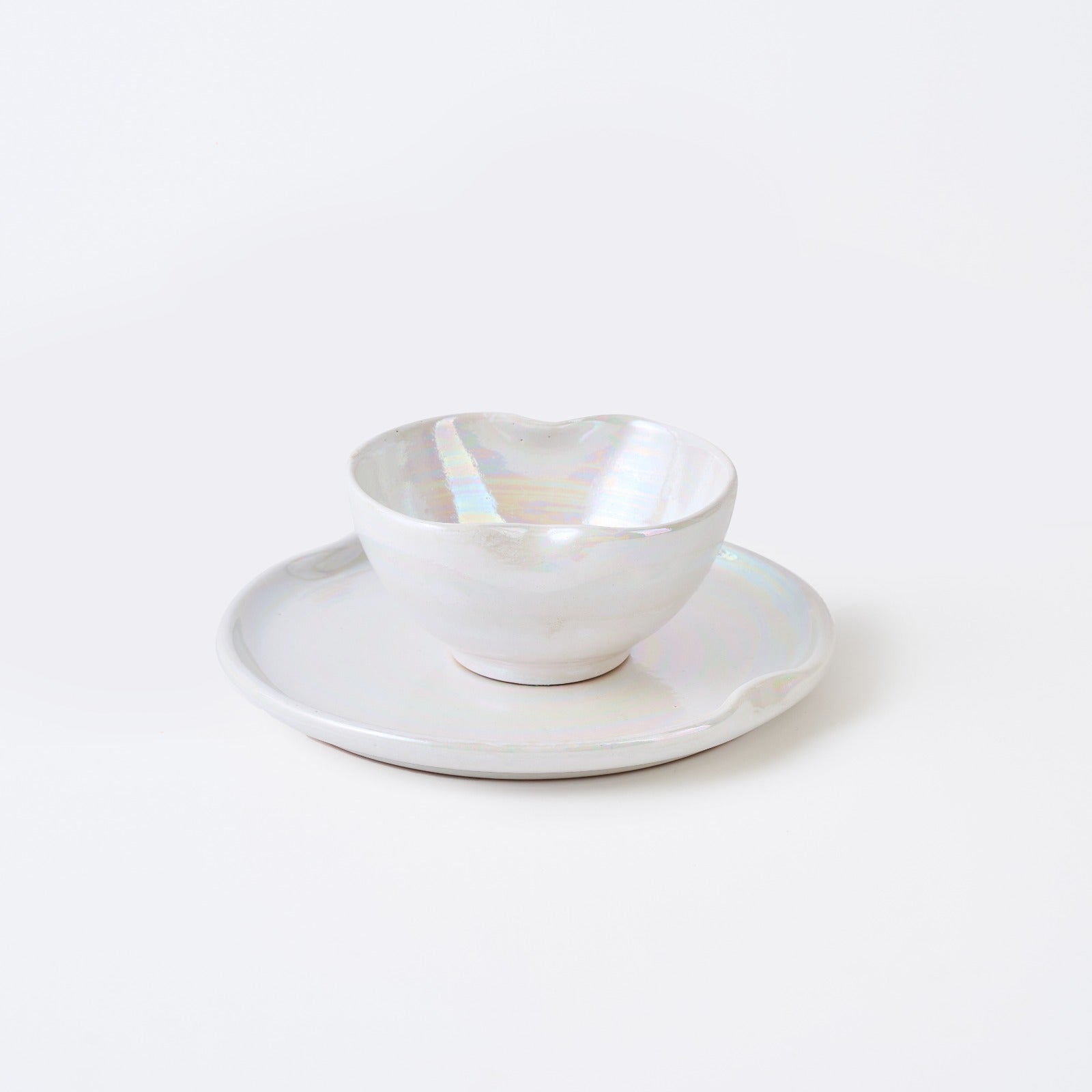 Description: Clean and Essential Dinnerware Set. This set includes 2 plates (27 cm) and a 13 cm bowl, featuring a unique changing color effect with a pearl white finish. The pieces have a flat shape with a slightly raised edge. Each product is handmade, so slight variations in shape and design application may occur. Additionally, color may vary slightly due to the positioning in the kiln.