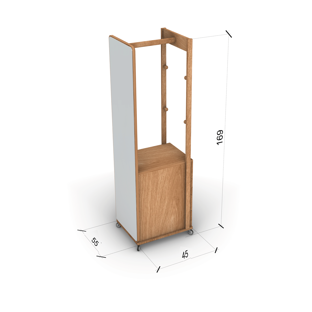 Description: This versatile Rekala mirror rack seamlessly blends function and style. Behind the full-length mirror, you'll find generous storage space, while a simple spin reveals a clothes hanger, offering a smart and space-efficient solution.